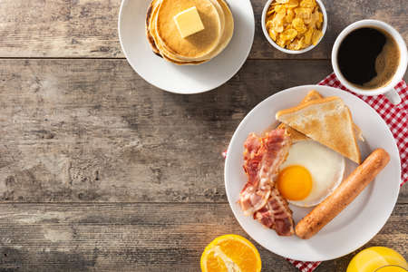 Top view of tasty breakfast with assorted meals served on the wooden table