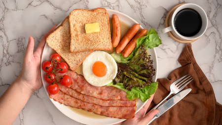 A female hands holding a plate of healthy breakfast over marble dining table background. top view