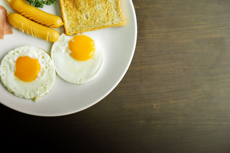 Traditional American breakfast with fried egg, toast, bacon and sausage on wooden table