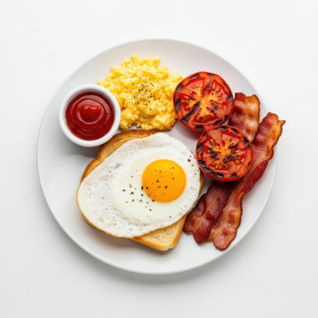 Breakfast plate with egg, bacon, tomato, and ketchup isolated on white background