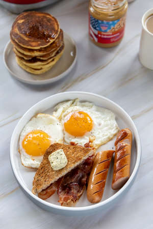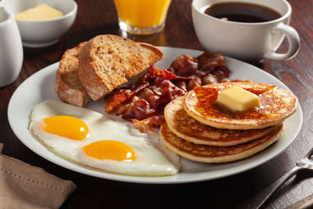 American bacon, eggs, pancakes and toast breakfast. Traditional American breakfast .