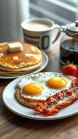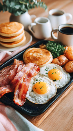 Delicious breakfast platter includes crispy bacon, sunny-side-up eggs, fluffy pancakes, and hash browns, served with coffee in a warm, inviting atmosphere