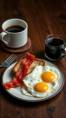 A serene breakfast scene featuring two sunny-side-up eggs, crispy bacon, and toast accompanied by a cup of coffee, perfect for starting the day.