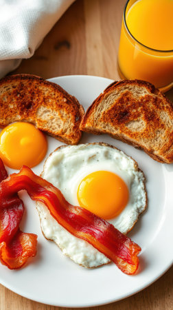 Delicious breakfast platter with eggs, bacon, and toast served with fresh juice