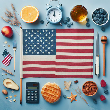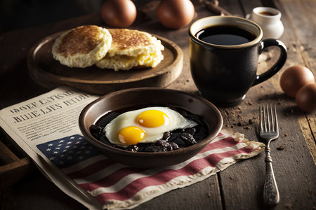Ai generated illustration of Flag of USA sunny eggs cup of coffee and toast on wood table