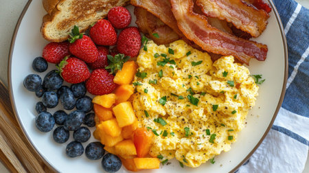 Top view of a hearty breakfast plate with scrambled eggs, bacon, toast, and a side of fresh fruit.