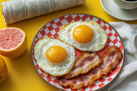 Delicious breakfast feast sunny-side up eggs crispy bacon and fresh grapefruit on a yellow table
