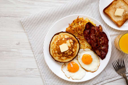 Full American Breakfast with Bacon, Hash Browns, Eggs and Pancakes on a plate on a white wooden background, top view. Flat lay, overhead, from above. Space for text.