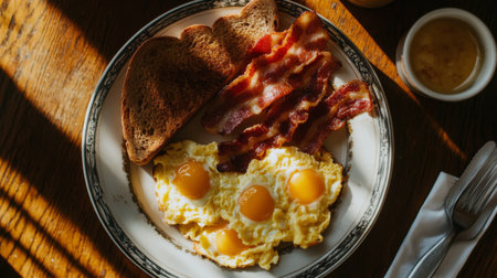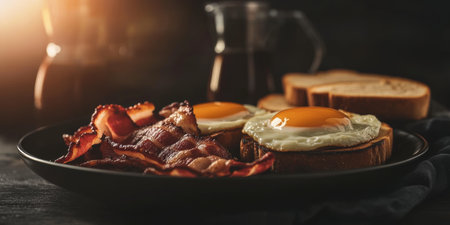 Delicious Breakfast with Crispy Bacon, Sunny Side Up Eggs, and Toast.