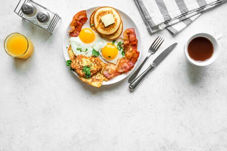 Full American Breakfast on white, top view, copy space. Sunny side fried eggs, roasted bacon, hash brown, pancakes, orange juice and coffee for breakfast.