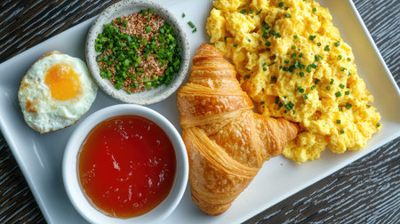 A delightful breakfast plate featuring fluffy scrambled eggs, a buttery croissant, a fried egg, and tangy chutney, beautifully arranged for a satisfying meal.