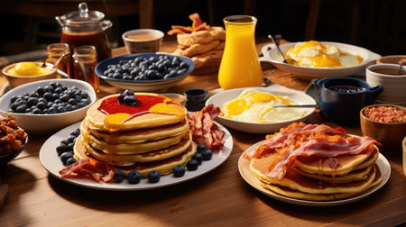 Delicious breakfast with pancakes, eggs, bacon, and coffee served on a wooden table in a cozy setting