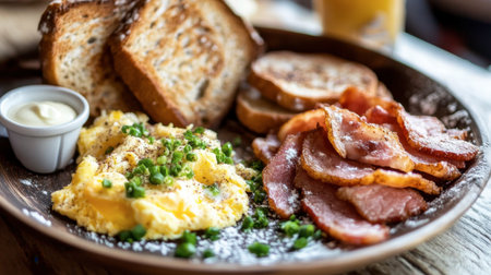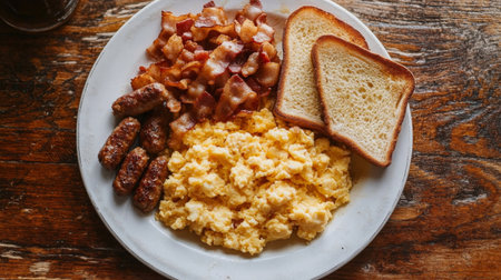 Savor a comforting breakfast plate featuring fluffy scrambled eggs, crispy bacon, savory sausages, and toasted bread on a charming wooden table. Perfect for a nourishing start to the day!