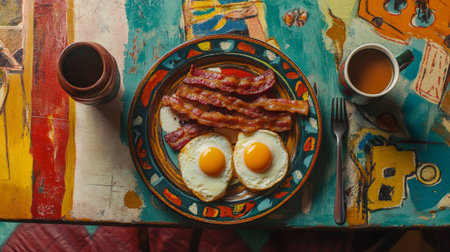 A vibrant breakfast scene showcasing a plate of sunny-side-up eggs and crispy bacon, set against a colorful table backdrop, perfect for conveying morning warmth.