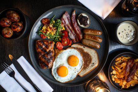 A mouthwatering breakfast spread showcasing sunny-side up eggs, crispy bacon, golden hash browns, baked beans, and fresh toast, perfect for any morning or brunch gathering.