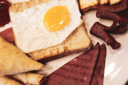 Breakfast with fried eggs, bacon and toasts in a restaurant