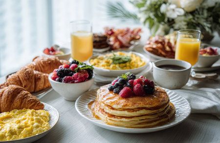 A beautifully set table for a lavish weekend brunch features a stack of golden pancakes drizzled with syrup and topped with fresh berries, alongside buttery croissants, scrambled eggs, and orange juice