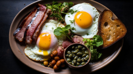 Savor a hearty breakfast featuring perfectly cooked eggs, crispy bacon, and vibrant greens. Accompanied by beans and toasted bread, this meal delights the senses at any hour.