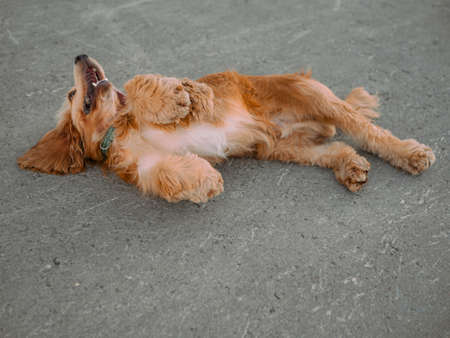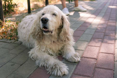 Senior cocker spaniel dog laying on walk path in park at sunny day.