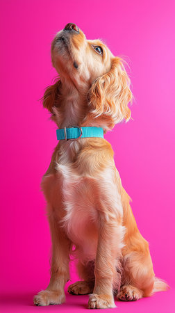 Cocker Spaniel dog with blue collar isolated on pink background.