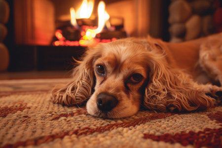 Cozy winter evening with cocker spaniel by the fireplace