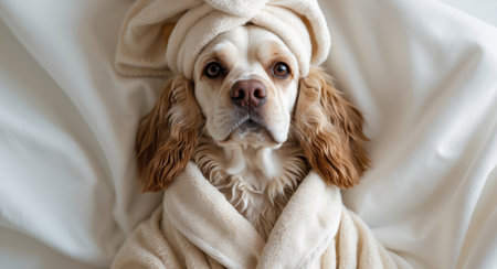 AI Generated. Cocker spaniel dog relaxing wearing bathrobe and towel turban after shower