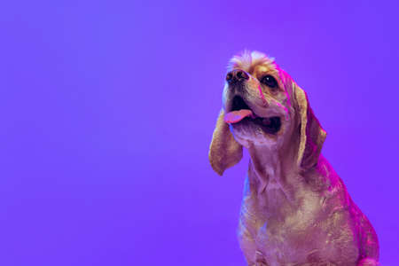 Closeup. Portrait of golden color purebred dog, Cocker Spaniel posing isolated on purple studio background in neon light. Concept of motion, pets love, animal life, vet.