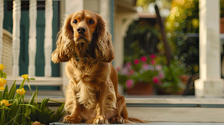 A friendly Cocker Spaniel with its fluffy ears and wagging tail, sitting on a porch.