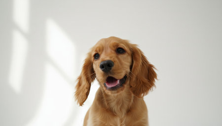 Happy cocker spaniel puppy with a caramel coat looking into the camera, mouth open and tongue visible, showing pure joy and playful energy on a clean white background with subtle shadow