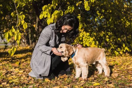 Attractive asian woman feeds her cocker spaniel in autumn park