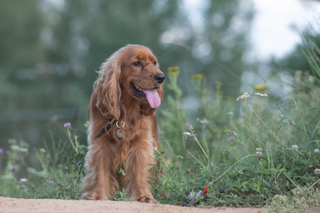 A beautiful, healthy spaniel dog stuck out her tongue. The dog walks in nature. The spaniel is basking in the sun.