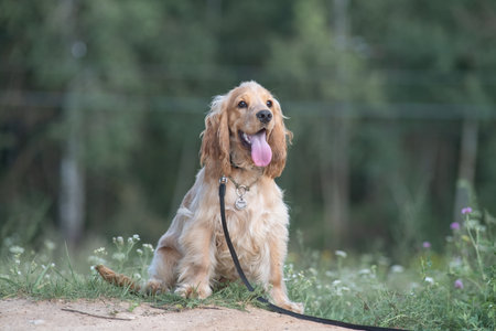 Dog cocker spaniel walk in park in the summer day.