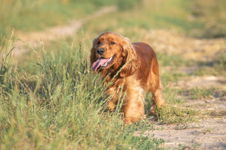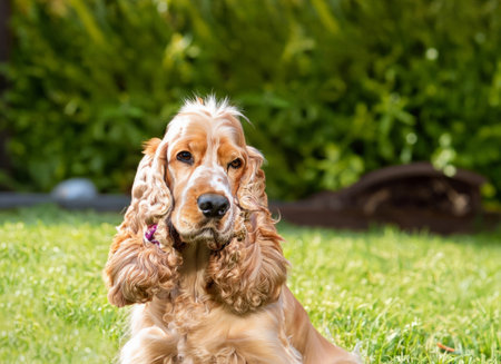 American Cocker Spaniel young in the green grass, evening sun, space for text, close-up.