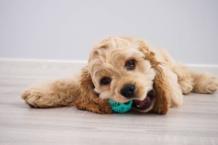 Dog. American Cocker Spaniel puppy with a ball on a gray background