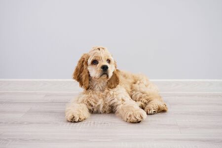 Young american cocker spaniel sitting on the floor against gray background, place for text