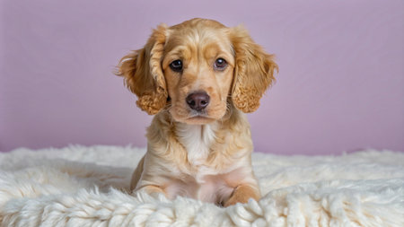 Cute Golden Cocker Spaniel Puppy Lying on a White Fur Rug Against a Pastel Pink Background.