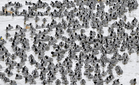 Flock of coots ( fulica atra ) walking on frozen surface of the lake.