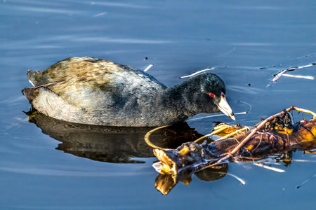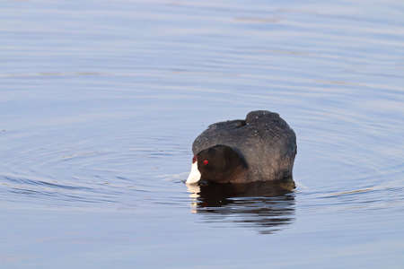 American coot searching for food in blue water