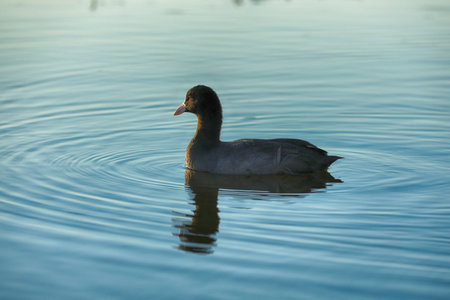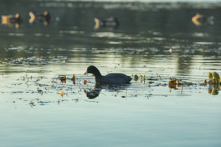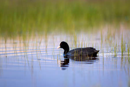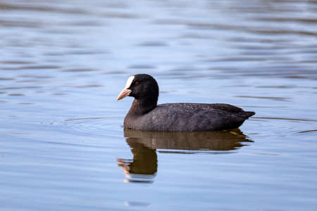 Coot (Fulica atra), a black water bird, swims in the calm water of the pond.