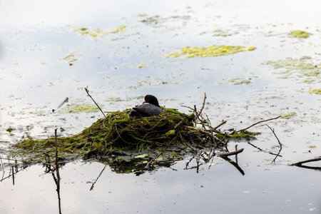 This tranquil image captures a moment of solitude, featuring a Eurasian coot, Fulica atra, nestled securely on its nest amid a serene pond. The nest is an assemblage of algae, twigs, and pond debris, reflecting the birds resourcefulness in using available materials. The coots glossy black plumage and distinctive white facial shield stand out against the soft, muted tones of the surrounding water and vegetation, creating a striking contrast. The surrounding algae strewn water hints at a rich, albeit hidden, ecosystem below the surface. Nesting Fowl Solitude. High quality photo