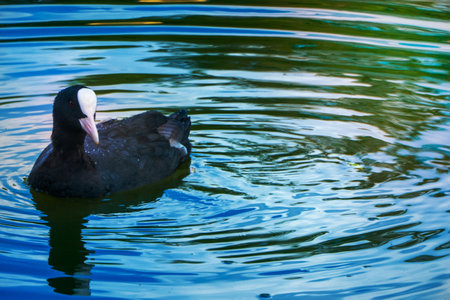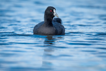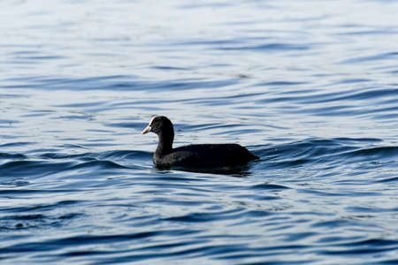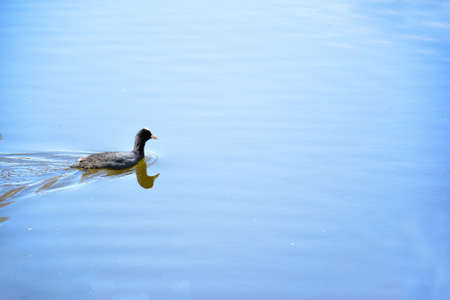 Fulica atra swimming on blue lake