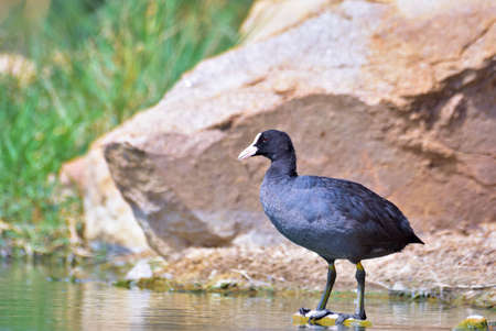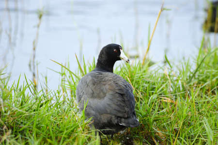 American Coot Duck, Fulica americana, at the side of a pond in summer