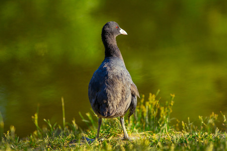 Bald coot with red eyes standing before green water looking at observer