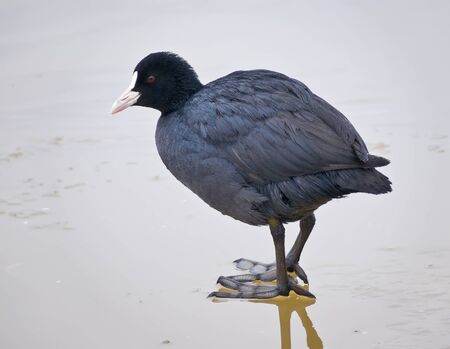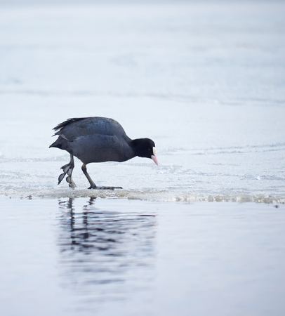 Eurasian Coot standing on ice in winter