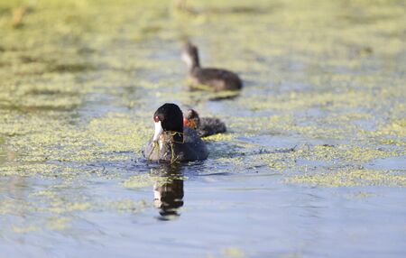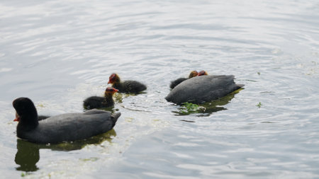 coot family feeding in a pond in spring