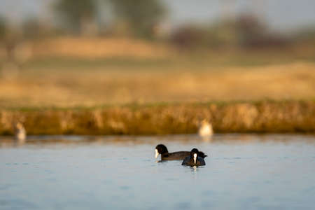 Eurasian coot birds on the river in summer time. Wildlife