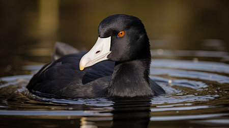the american coot, a large waterbird with a distinctive white forehead shield, is showcased in this high-quality passport photo, expertly captured using a 50mm lens, highlighting its grey and black plumage, red eyes, and characteristic lobed toes, set against a natural wetland habitat. ai generated