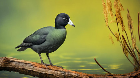 the american coot perches elegantly on a weathered wood branch, its sleek black plumage and snowy white forehead standing out against a lush green background, showcasing its natural beauty in this stunning wildlife photography capture. ai generated