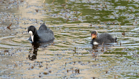 Eurasian or common coot, fulicula atra, duck and duckling on the waterlake
