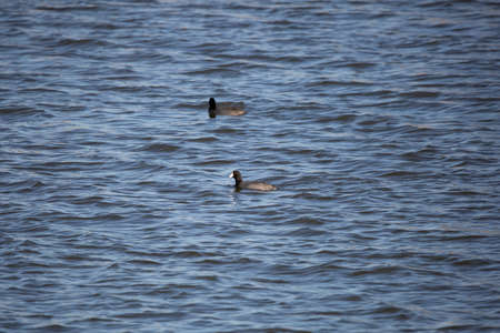 Pair of American coot ducks (Fulica americana) swimming in choppy water